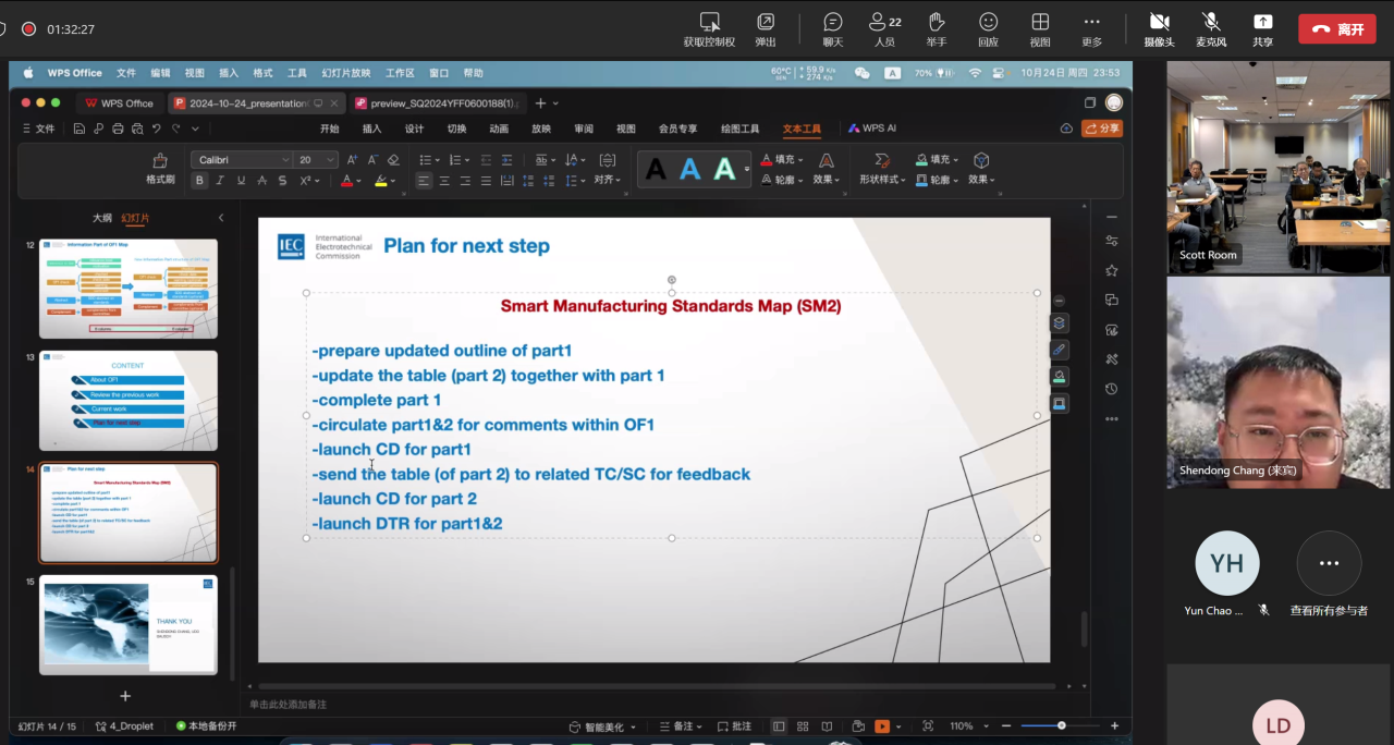 會議總結了IEC/SyC SM2023年全會以來的工作進展,各工作組分別做工作匯報,與會專家圍繞智能制造用例模板、標準圖、協同安全、數據空間等重點工作進行深入討論,形成14項重要決議。本次會議主要成果如下: