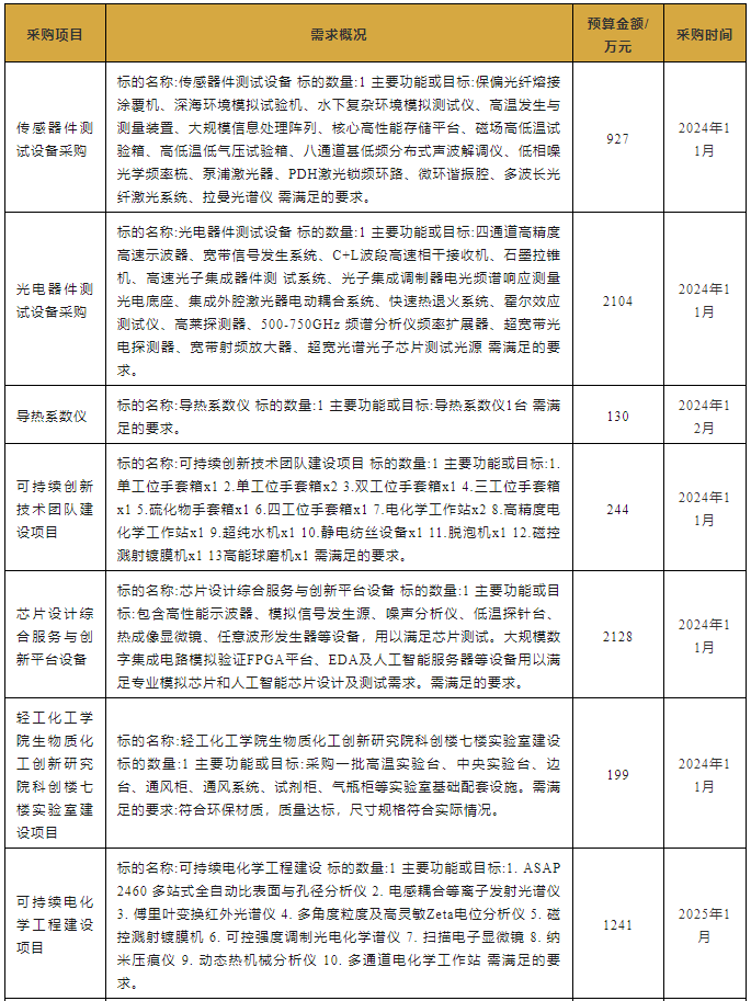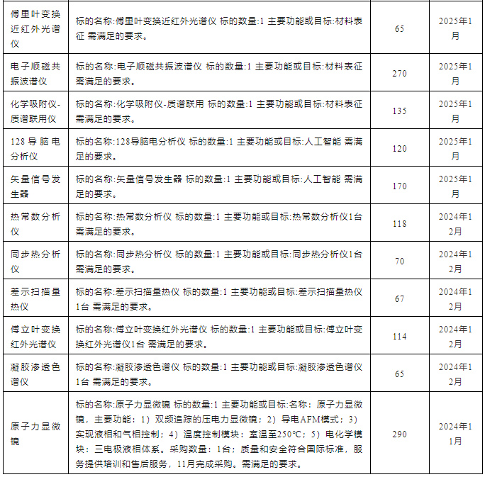 近日,廣東工業(yè)大學(xué)發(fā)布18項(xiàng)儀器設(shè)備采購意向,預(yù)算總額達(dá)8457萬元,涉及電感耦合等離子發(fā)射光譜儀、八通道甚低頻分布式聲波解調(diào)儀、低相噪光學(xué)頻率梳、電子順磁共振波譜儀、多角度粒度及高靈敏Zeta電位分析儀、拉曼光譜儀等,預(yù)計采購時間為2024年11月~2025年1月。