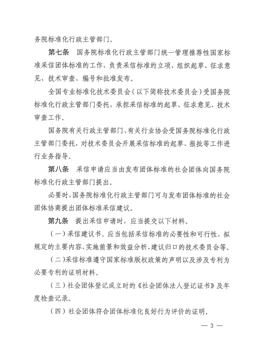 三是符合團體標準化良好行為標準的社會團體。通過評價符合《團體標準化 1部分:良好行為指南》(GB/T 20004.1)、《團體標準化 第2部分:良好行為評價指南》(GB/T 20004.2)等國家標準的社會團體,其制定的標準才具備被采信條件。