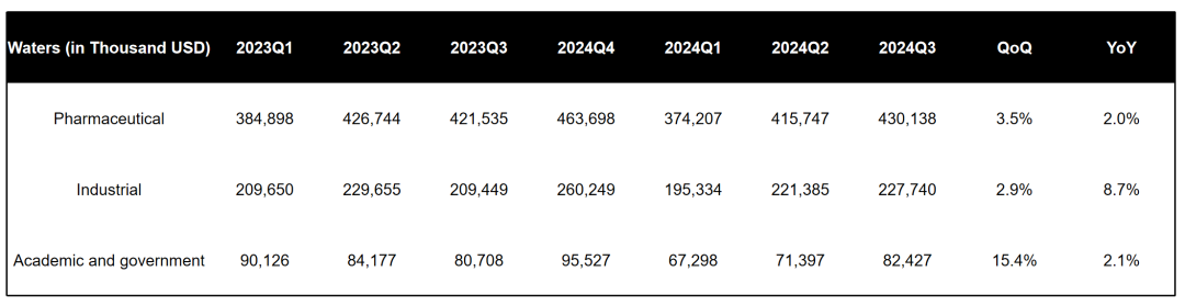 Waters2024Q3財報顯示,公司本季度營收7.40億美元,超過此前指引,同比增長4%。凈利潤1.615億美元,同比大增20%。值得注意的是,根據Waters財報,2024Q1/Q2期營收均同比下滑,尤其是Q1更是大幅下降。