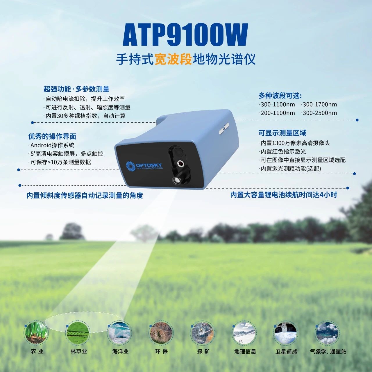 地物光譜儀作為測量地表物質(zhì)光譜特性的核心設(shè)備,廣泛應(yīng)用于生態(tài)環(huán)境監(jiān)測、農(nóng)業(yè)資源管理、礦產(chǎn)資源勘查等重要領(lǐng)域。但長期以來,業(yè)內(nèi)缺乏統(tǒng)一的技術(shù)標(biāo)準(zhǔn),制約了該設(shè)備在各領(lǐng)域的廣泛應(yīng)用和可靠性保障。奧譜天成作為國內(nèi)領(lǐng)先國際知名的高端光譜儀器提供商,通過近十年的自主研發(fā),具備豐富完整的地物光譜系列產(chǎn)品,現(xiàn)已廣泛應(yīng)用于農(nóng)業(yè)、林草業(yè)、探礦、氣象學(xué)等多個行業(yè)和領(lǐng)域。