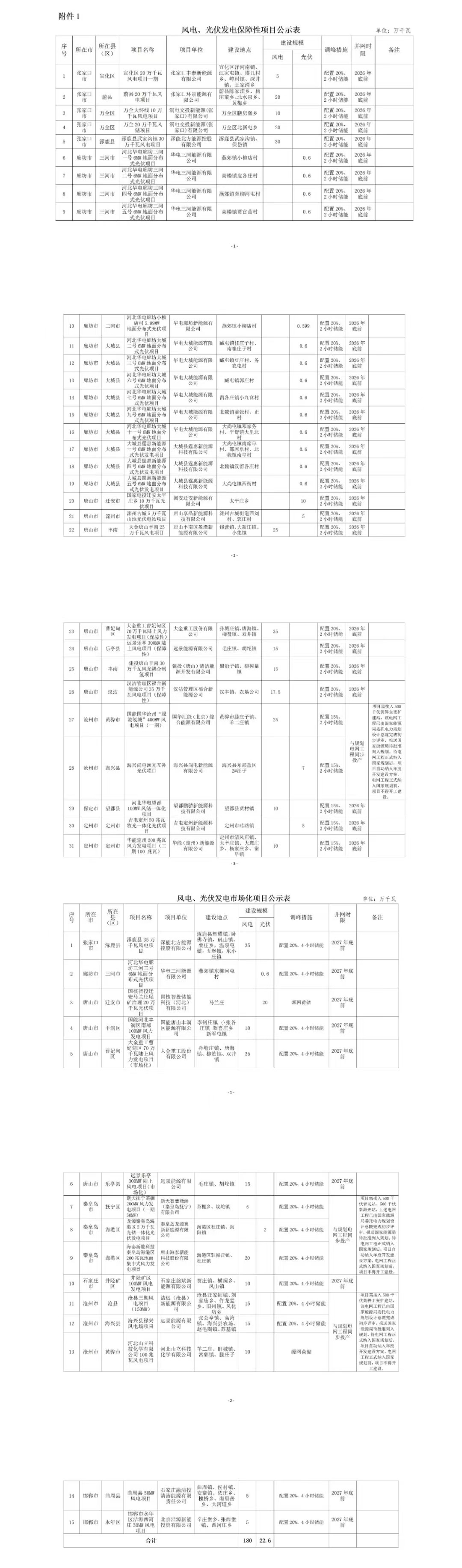 第三批:47個,4.85GW第三批擬公示項(xiàng)目共47個、總規(guī)模485.499萬千瓦,其中保障性項(xiàng)目共32個、282.899萬千瓦,市場化項(xiàng)目共15個、202.6萬千瓦。根據(jù)項(xiàng)目單位來看,獲得項(xiàng)目指標(biāo)最多的企業(yè)為大金重工,規(guī)模為95萬千瓦;其次是深圳能源,規(guī)模為65萬千瓦;隨后是遠(yuǎn)景能源,規(guī)模為45萬千瓦。這3家企業(yè)項(xiàng)目均為風(fēng)電項(xiàng)目。從風(fēng)電、光伏項(xiàng)目區(qū)域分布來看,唐山市獲得項(xiàng)目容量最多,為202.5萬千瓦,其次是張家口市,規(guī)模為120萬千瓦,然后是滄州市,規(guī)模為72萬千瓦。