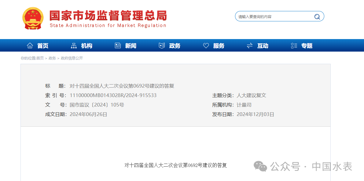 近日,人大代表李豐提出的《關(guān)于優(yōu)化智能水表檢測流程,資源節(jié)約集約利用的建議》獲市場監(jiān)管總局回復(fù)。市場監(jiān)管總局回復(fù)將積極研究探索跨區(qū)域一體化計量器具強制檢定制度改革,推動區(qū)域間強制檢定結(jié)果互認(rèn),為“二檢合一”在更大范圍推廣奠定制度基礎(chǔ)。