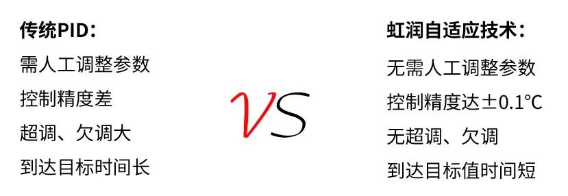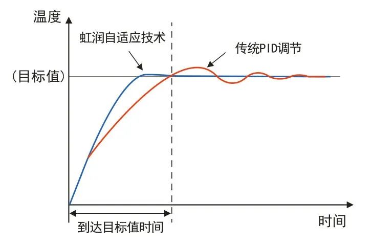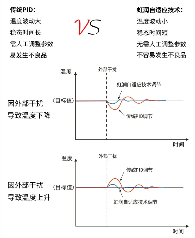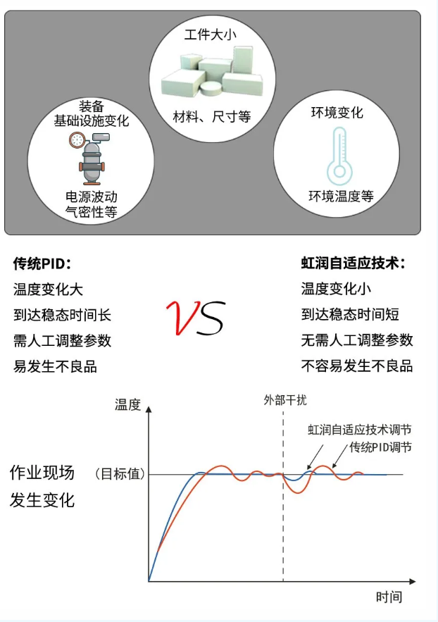 虹潤自適應(yīng)控制技術(shù)可自動整定出較佳PID值。監(jiān)視裝備的溫度控制狀態(tài),自動調(diào)節(jié)PID值,對工件變化及裝備變化、環(huán)境變化等進(jìn)行較佳溫度控制。
