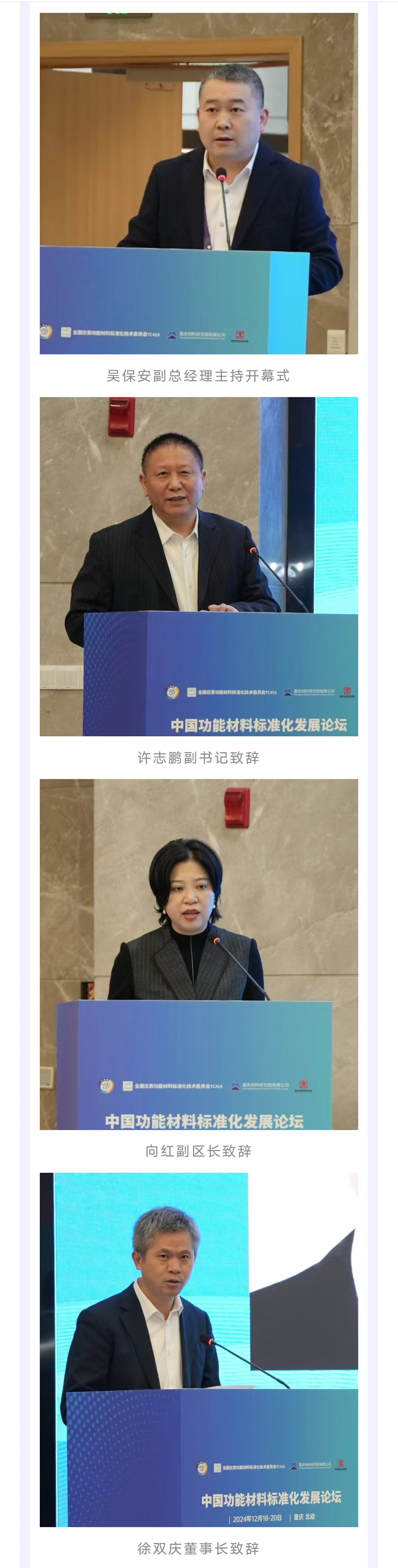 開幕式由重材院黨委委員、副總經(jīng)理(主持經(jīng)理層工作)吳保安主持。許志鵬副書記、向紅副區(qū)長、徐雙慶董事長分別致辭并指出功能材料是支撐國民經(jīng)濟(jì)發(fā)展的基礎(chǔ)性產(chǎn)業(yè),是產(chǎn)業(yè)基礎(chǔ)再造的主力軍和工業(yè)綠色發(fā)展的主戰(zhàn)場。標(biāo)準(zhǔn)在功能材料工業(yè)發(fā)展中發(fā)揮著基礎(chǔ)性、引領(lǐng)性作用。希望與會專家學(xué)者凝心聚力,積極建言獻(xiàn)策,不斷開創(chuàng)功能材料標(biāo)準(zhǔn)化工作新局面,為發(fā)展新質(zhì)生產(chǎn)力,實現(xiàn)功能材料行業(yè)高質(zhì)量發(fā)展貢獻(xiàn)力量。