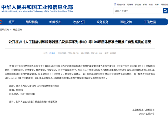 工信部12月30日發(fā)布消息,根據(jù)《工業(yè)和信息化部辦公廳關于開展2024年工業(yè)和信息化百項團體標準應用推廣典型案例遴選工作的通知》(工信廳科函〔2024〕257號)的程序和要求,經項目申報、形式審查、技術審查、專家論證、合規(guī)性審查等程序,擬將《人工智能訓練服務器整機及集群系列標準》等104項團體標準列入2024年百項團體標準應用推廣典型案例,現(xiàn)面向社會公開征求意見。