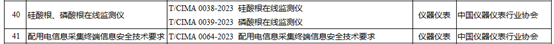 由中國儀器儀表行業(yè)協(xié)會發(fā)布的3項團體標準T/CIMA 0038-2023《硅酸根在線監(jiān)測儀》、T/CIMA 0039-2023《磷酸根在線監(jiān)測儀》和T/CIMA 0064-2023《配用電信息采集終端信息安全技術要求》被納入公示名單。