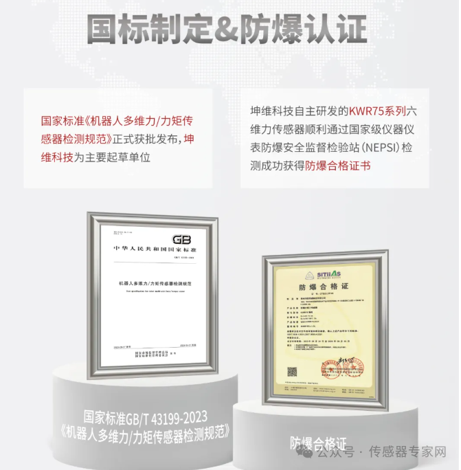 為擴(kuò)張未來(lái)機(jī)器人在更多場(chǎng)景的應(yīng)用,坤維科技率先研發(fā)出獲得防爆認(rèn)證標(biāo)準(zhǔn)(等同于國(guó)際IEC60079標(biāo)準(zhǔn)體系)的KWR75系列六維力傳感器,可在煤礦、金屬加工、造紙等工業(yè)粉塵較多的場(chǎng)景中使用——這些惡劣環(huán)境往往對(duì)人形機(jī)器人有更強(qiáng)烈的需求。