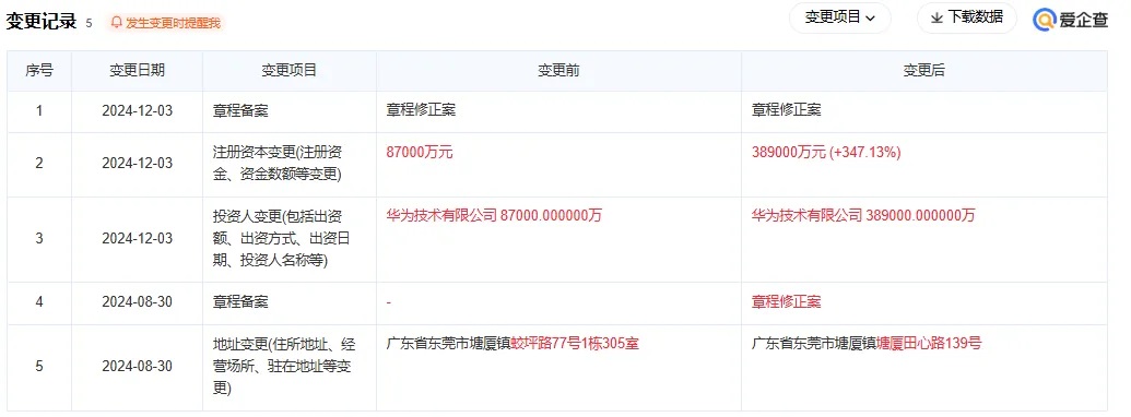 12月3日,華為對(duì)其全資持股的機(jī)器人企業(yè)——東莞極目機(jī)器有限公司,增資30余億元,注冊(cè)資本從8.7億人民幣增至38.9億人民幣,增幅約347%。