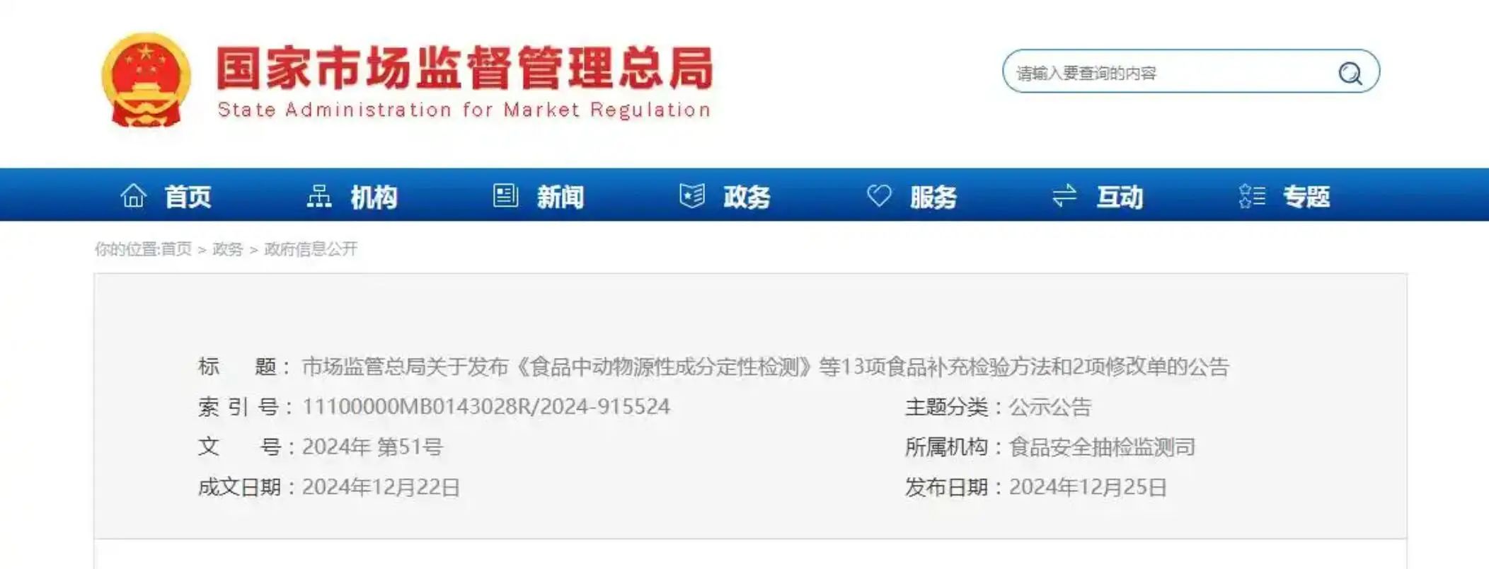 根據《中華人民共和國食品安全法實施條例》有關規定,近期,市場監管總局批準發布《食品中動物源性成分定性檢測》等13項食品補充檢驗方法和2項修改單。
