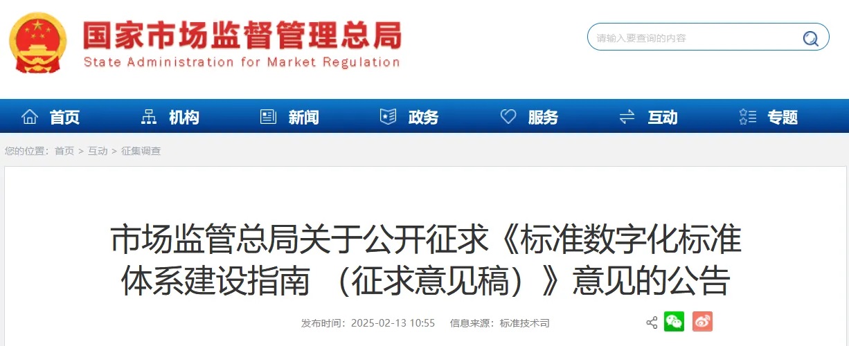 為深入貫徹落實黨中央、國務院關于推動標準化工作向數(shù)字化、網(wǎng)絡化、智能化轉(zhuǎn)型的決策部署,實施《國家標準化發(fā)展綱要》和《質(zhì)量強國建設綱要》,充分發(fā)揮標準的基礎性、引領性作用,加快構建結構合理、層次分明、適應經(jīng)濟社會高質(zhì)量發(fā)展的標準數(shù)字化標準體系。市場監(jiān)管總局起草了《標準數(shù)字化標準體系建設指南 (征求意見稿)》,現(xiàn)向社會公開征求意見,意見反饋截止日期為2025年3月12日。公眾可以通過以下途徑和方式提出意見: