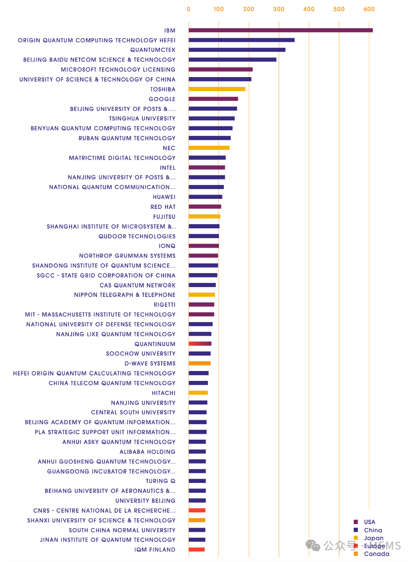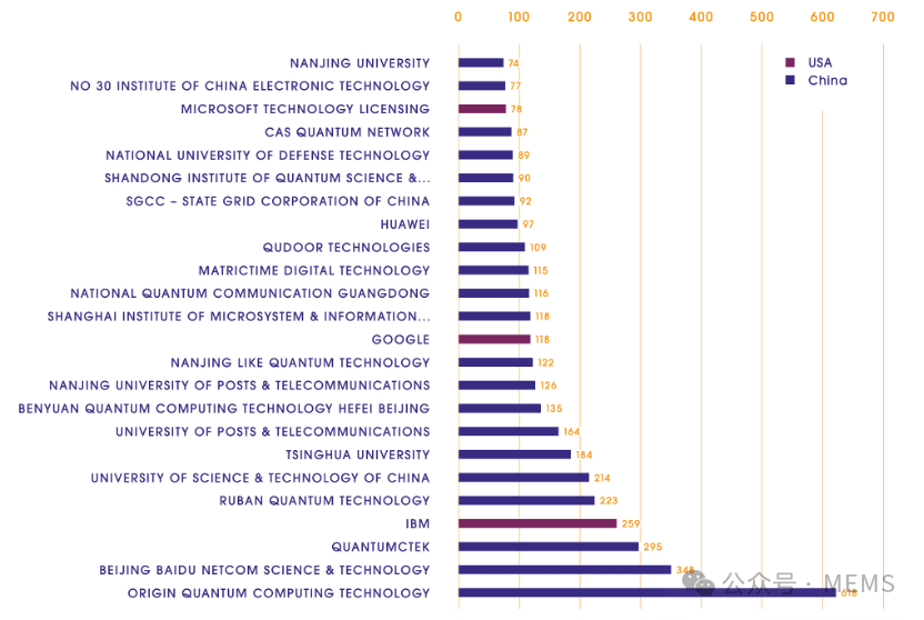 在中國申請的量子技術(shù)專利按申請量排名,前25位專利申請人中,除了三家來自美國的申請人(IBM、谷歌和微軟),其他全部為中國本土機構(gòu),包括本源量子計算科技(合肥)股份有限公司、北京百度網(wǎng)訊科技有限公司、科大國盾量子技術(shù)股份有限公司、如班量子科技有限公司、中國科學技術(shù)大學、清華大學、北京郵電大學及南京郵電大學等。