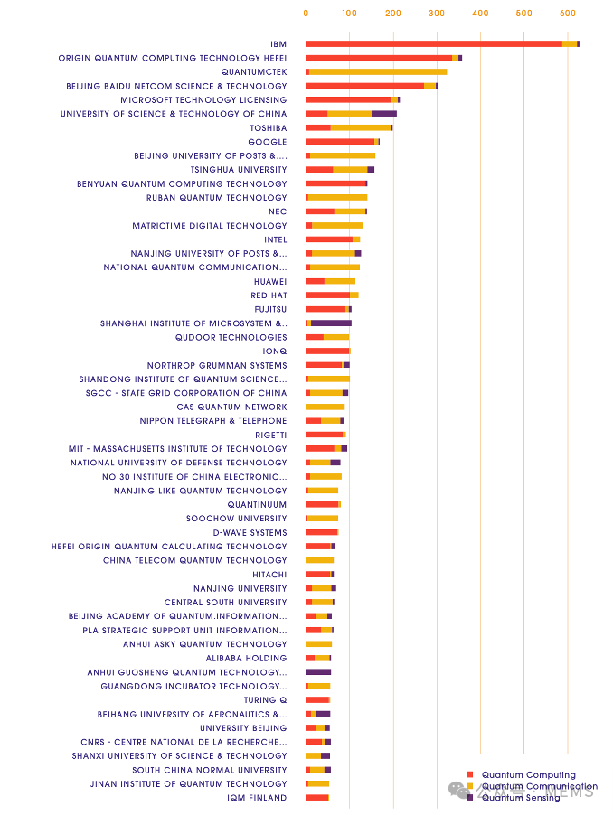 按技術(shù)類型細分,來自中國排名前三的機構(gòu),本源量子計算科技(合肥)股份有限公司和北京百度網(wǎng)訊科技有限公司主要聚焦量子計算技術(shù),科大國盾量子技術(shù)股份有限公司則主要聚焦量子通信技術(shù)。在量子傳感技術(shù)領(lǐng)域有大量專利布局的中國機構(gòu)有:中國科學技術(shù)大學、中國科學院上海微系統(tǒng)與信息技術(shù)研究所、安徽省國盛量子科技有限公司以及北京航空航天大學等。