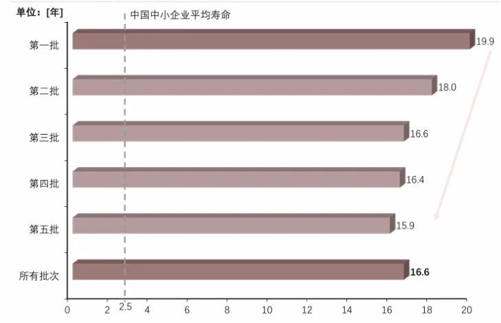 專精特新“小巨人”企業平均成立年限為16.6年,遠超中國中小企業平均壽命2.5年,這表明企業需經過長時間專業能力積累和沉淀,憑借過硬的技術、產品及抗風險能力,才能進入穩定發展階段。從各批次來看,2019—2023年五批次企業平均壽命呈遞減趨勢,反映出經濟發展、企業擴張和政策支持使專精特新“小巨人”企業成長周期縮短,未來有望實現更快成長。