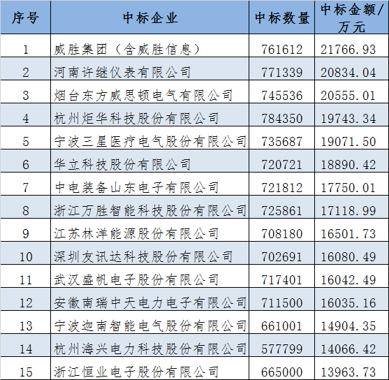 2025年度第一次招標電能表采集整體中標金額前15企業(yè)