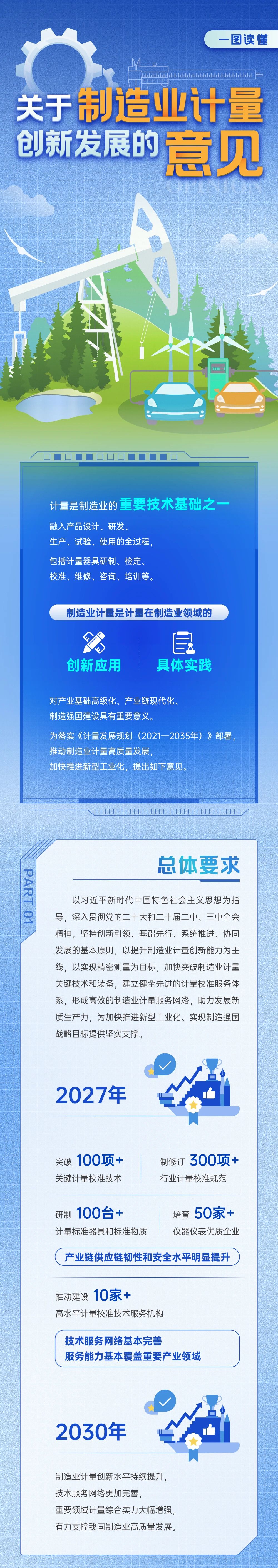《意見》是制造業計量領域首個政策性文件,堅持創新引領、基礎先行、系統推進、協同發展的基本原則,以提升制造業計量創新能力為主線,以實現精密測量為目標,結合當前產業現狀和制造業高質量發展要求,提出到2027年,制造業計量發展取得積極進展,突破100項以上關鍵計量校準技術,制修訂300項以上行業計量校準規范,研制100臺套以上計量器具和標準物質,產業鏈供應鏈韌性和安全水平明顯提升,培育50家以上儀器儀表優質企業,推動建設10家以上制造業高水平計量校準技術服務機構,技術服務網絡基本完善,服務能力基本覆蓋重要產業領域。到2030年,制造業計量創新水平持續提升,技術服務網絡更加完善,重要領域計量綜合實力大幅增強,有力支撐我國制造業高質量發展。