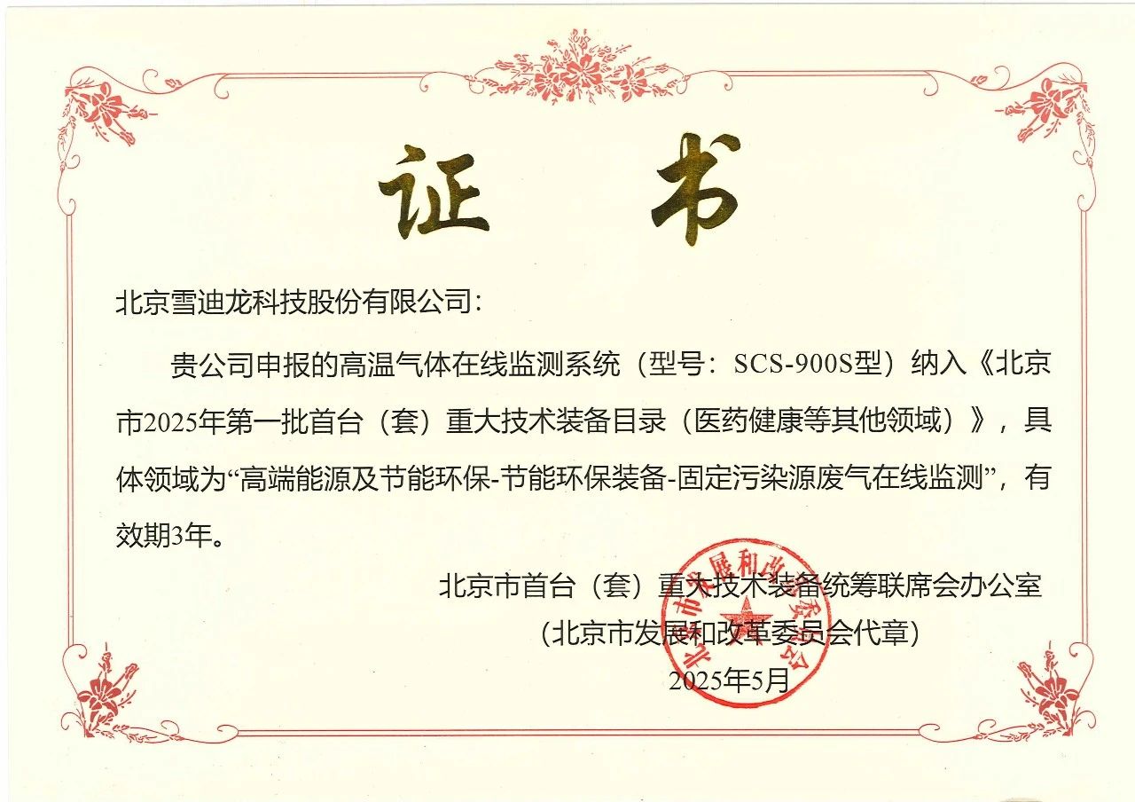 近日,北京市發展和改革委員會正式公布“北京市2025年第一批首臺(套)重大技術裝備目錄”,雪迪龍自主研發的高溫氣體在線監測系統(SCS-900S)成功入選,展現了雪迪龍在環保裝備領域的技術實力和創新能力。