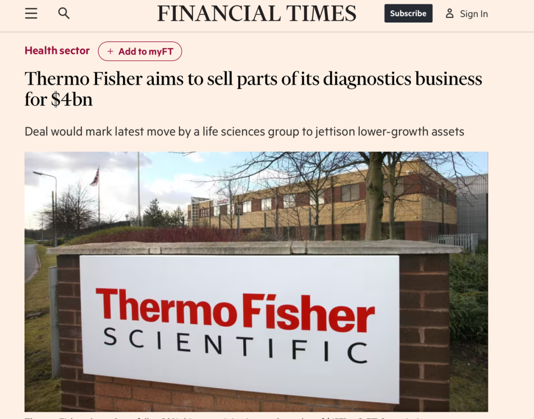 待售的診斷業(yè)務(wù)部門年調(diào)整后收益約3億美元,年銷售額達(dá)14億美元,約占賽默飛世爾整體專業(yè)診斷事業(yè)部收入的三分之一。知情人士補(bǔ)充稱,公司期望以超40億美元的價格完成交易。