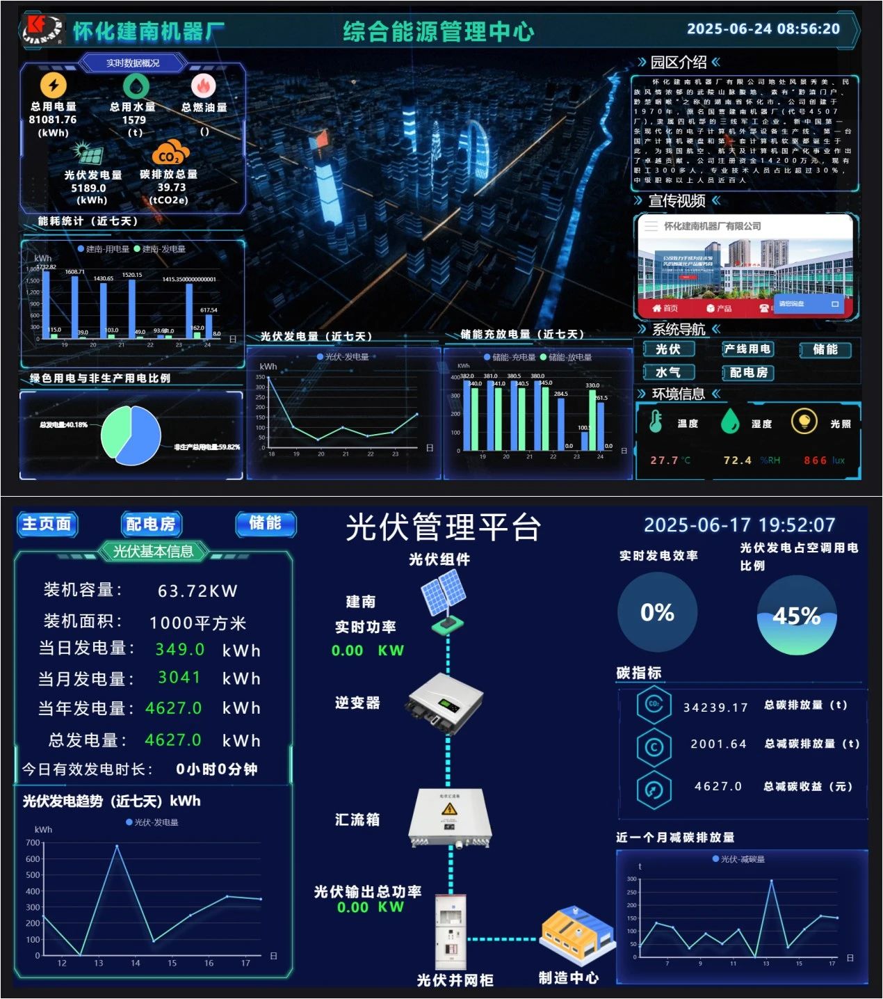 綜合能源管理平臺(tái)部署在公司一樓展廳,智能LCD大屏實(shí)時(shí)動(dòng)態(tài)顯示園區(qū)發(fā)電及用電耗能情況,平臺(tái)軟件部署在云端。公司實(shí)現(xiàn)了生產(chǎn)用電與非生產(chǎn)用電分開監(jiān)測(cè),完成了各車間、各部門水電氣熱數(shù)據(jù)采集,并監(jiān)測(cè)重點(diǎn)設(shè)備能源使用情況。該管理平臺(tái)無(wú)論從整體架構(gòu)還是軟件開發(fā),全部由建南自主研發(fā)實(shí)施。智能微電網(wǎng)項(xiàng)目實(shí)施后,公司外部購(gòu)電量降低了約30%,實(shí)現(xiàn)了節(jié)能與綠色環(huán)保。