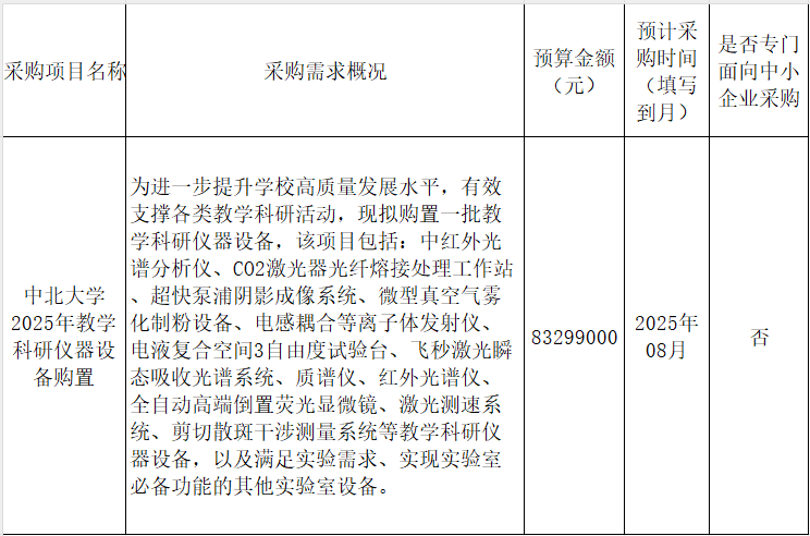 中北大學2025年7月至8月第二批政府采購意向