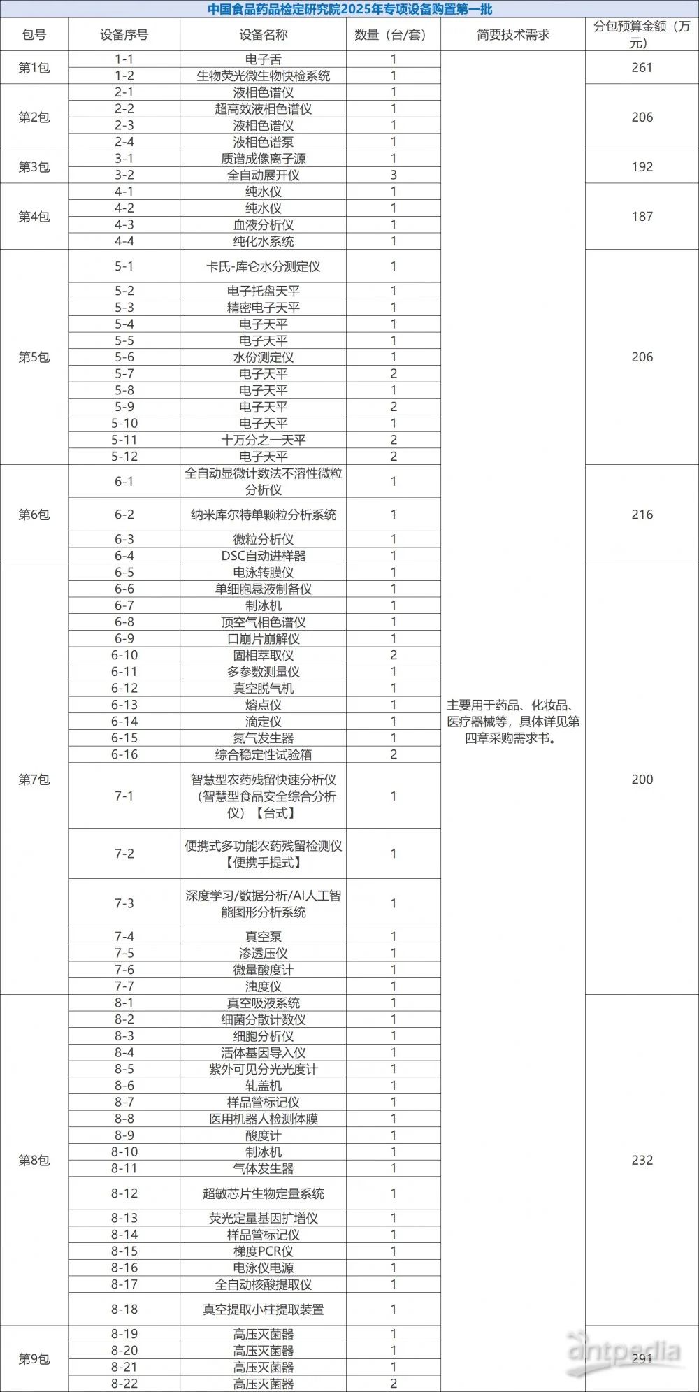 中國政府采購網消息,近日,中國食品藥品檢定研究院就2025年專項設備購置項目分別于6月24日和7月4日發布招標公告,招標總金額為6212萬元,采購的儀器設備共計605臺/套,包括超高效液相色譜儀、生物熒光微生物快檢系統、小動物活體成像系統等。
