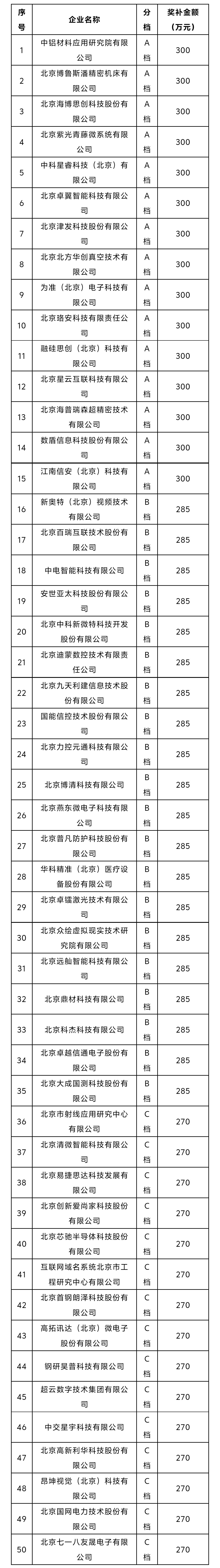 新一輪第一批重點“小巨人”企業高質量發展項目期初獎補資金擬對中鋁材料應用研究院有限公司等15家A檔企業、新奧特(北京)視頻技術有限公司等20家B檔企業、北京市射線應用研究中心有限公司等15家C檔企業進行獎補,詳情見附件。