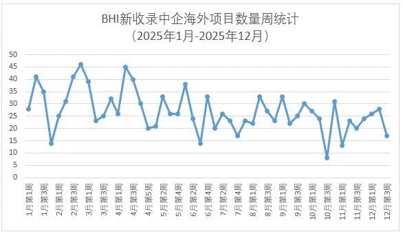 據(jù)BHI中企海外項(xiàng)目數(shù)據(jù)庫監(jiān)測,12月15日-19日BHI新收錄中企新簽約/中標(biāo)/公告海外項(xiàng)目17個(gè),較此前有所回落。2025年新收錄項(xiàng)目超過1320個(gè)。近一年每周新收錄項(xiàng)目數(shù)量趨勢統(tǒng)計(jì)詳見下圖。