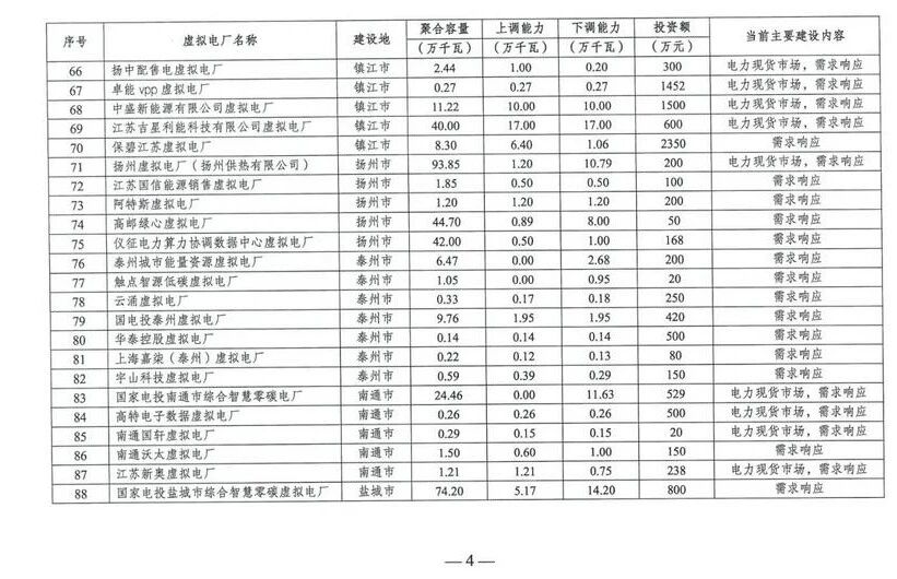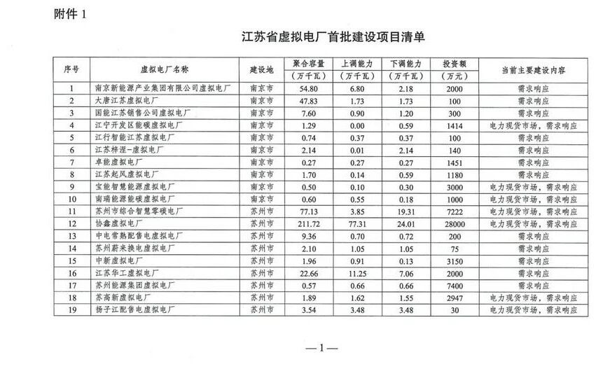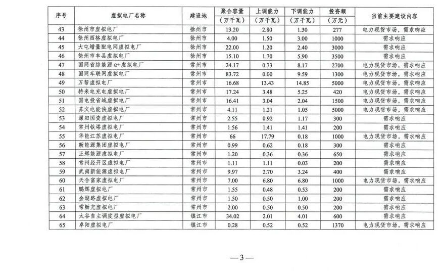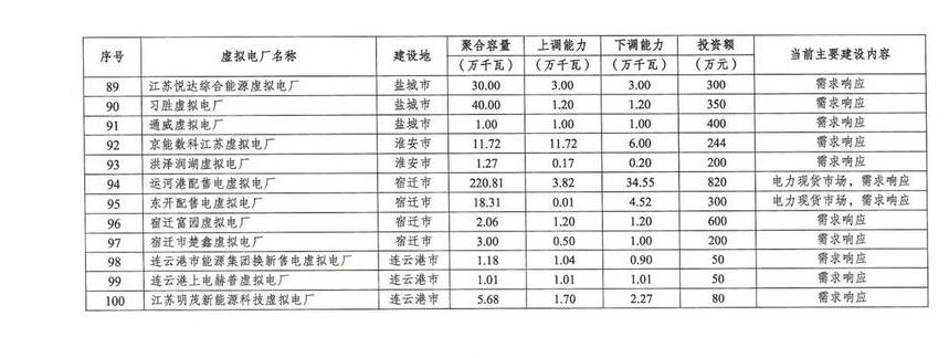 江蘇省首批建100個(gè)虛擬電廠項(xiàng)目,總聚合容量達(dá)16.98GW,上調(diào)能力2.75GW,下調(diào)能力3.17GW,涉及總投資額12.73億元;主要建設(shè)內(nèi)容為電力現(xiàn)貨市場(chǎng)及需求響應(yīng)。