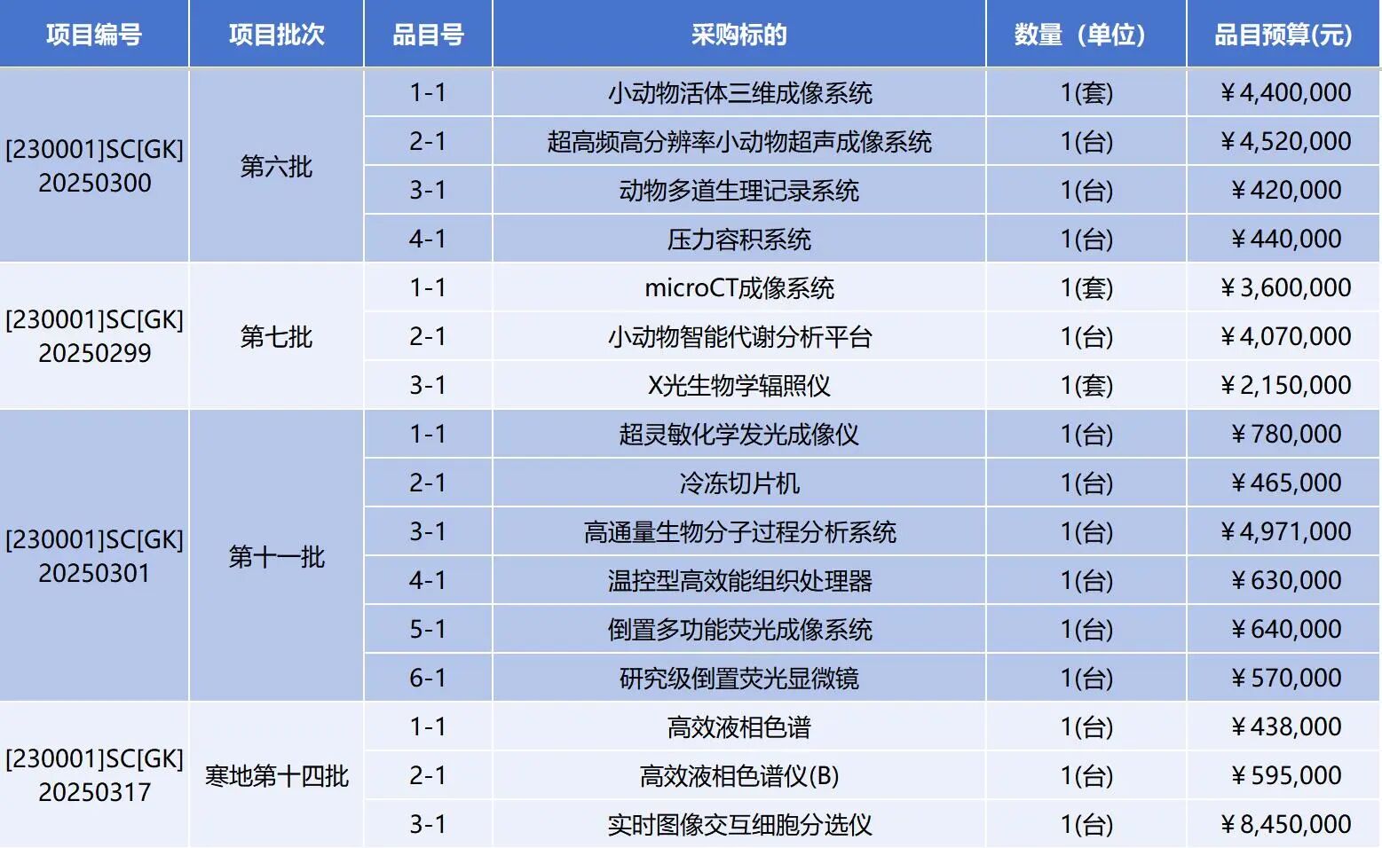 據(jù)統(tǒng)計(jì),本次計(jì)劃采購(gòu)的儀器設(shè)備總預(yù)計(jì)招標(biāo)金額超過(guò)8200萬(wàn)元,涵蓋四極桿飛行時(shí)間高分辨氣質(zhì)聯(lián)用儀、高效液相色譜儀、研究級(jí)倒置熒光顯微鏡、倒置多功能熒光成像系統(tǒng)、熒光定量PCR儀、高壓離子色譜儀、多功能酶標(biāo)儀、傅里葉變換紅外光譜儀、原子吸收光譜儀、超靈敏化學(xué)發(fā)光成像儀、超高頻高分辨率小動(dòng)物超聲成像系統(tǒng)、小動(dòng)物活體三維成像系統(tǒng)、超靈敏多功能成像系統(tǒng)、單細(xì)胞表型及功能蛋白組學(xué)可視化分析系統(tǒng)等共計(jì)40項(xiàng)高端科研設(shè)備。
