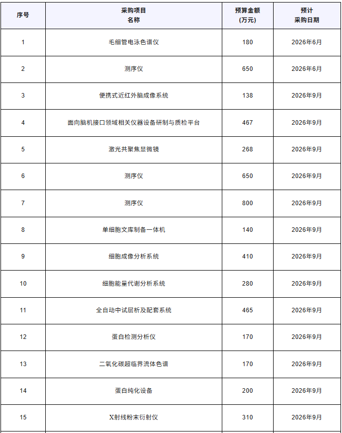 近日,南京醫科大學發布2026年2月(第2批)政府采購意向公告,計劃采購毛細管電泳色譜儀、測序儀、便攜式近紅外腦成像系統、激光共聚焦顯微鏡、蛋白檢測分析儀、X射線粉末衍射儀等儀器設備,總預算9364萬元,預計采購時間2026年6月~9月。