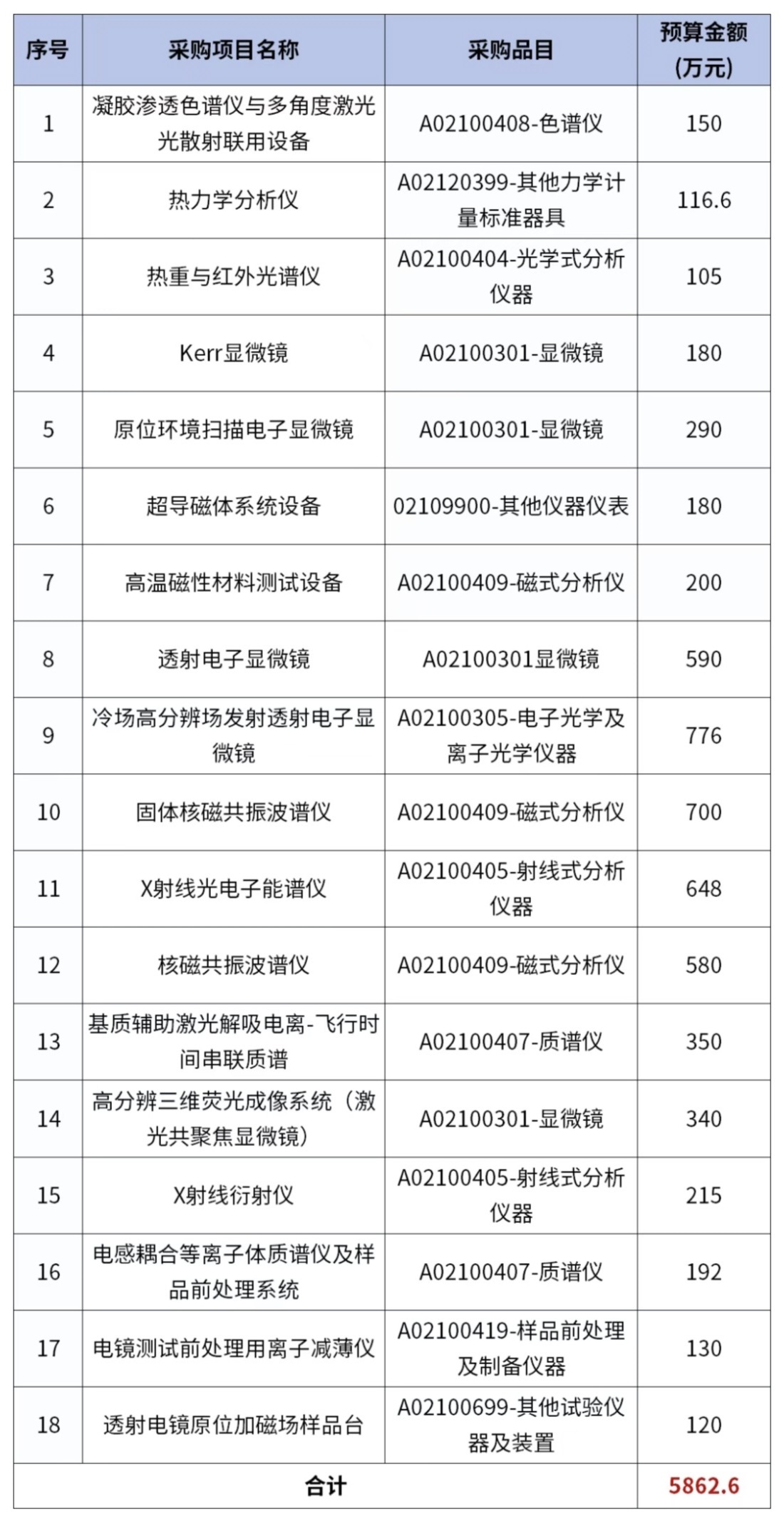 東華大學(xué)近日發(fā)布多項(xiàng)儀器設(shè)備采購計(jì)劃,擬采購凝膠滲透色譜儀與多角度激光光散射聯(lián)用設(shè)備、熱力學(xué)分析儀、熱重與紅外光譜儀、Kerr顯微鏡、原位環(huán)境掃描電子顯微鏡、超導(dǎo)磁體系統(tǒng)設(shè)備、高溫磁性材料測試設(shè)備等,項(xiàng)目預(yù)算總額5862.6萬元,采購項(xiàng)目均計(jì)劃于2026年3月實(shí)施。