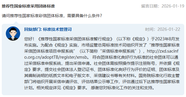 近期,有網友在市場監管總局網站公眾留言系統咨詢關于“國家標準引用、采用團體標準”的問題,市場監管總局給予了答復。