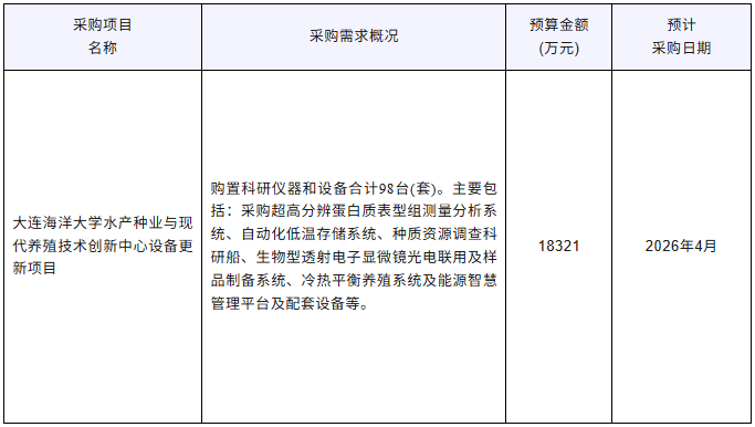 近期,大連海洋大學(xué)發(fā)布多項(xiàng)儀器采購(gòu)意向,采購(gòu)預(yù)算金額18321萬(wàn)元,涉及儀器設(shè)備包括超高分辨蛋白質(zhì)表型組測(cè)量分析系統(tǒng)、自動(dòng)化低溫存儲(chǔ)系統(tǒng)、種質(zhì)資源調(diào)查科研船、生物型透射電子顯微鏡光電聯(lián)用及樣品制備系統(tǒng)、冷熱平衡養(yǎng)殖系統(tǒng)及能源智慧管理平臺(tái)及配套設(shè)備等。預(yù)計(jì)采購(gòu)時(shí)間2026年4月。