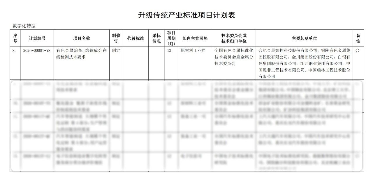近日,國家工業(yè)和信息化部正式發(fā)布《2026年第一批行業(yè)標(biāo)準(zhǔn)制修訂和外文版項目計劃》,由金星智控牽頭申報的《有色金屬冶煉熔體成分在線檢測技術(shù)要求》(計劃編號:2026-0008T-YS)行業(yè)標(biāo)準(zhǔn)獲批立項。這標(biāo)志著我國有色金屬冶煉熔體成分在線檢測領(lǐng)域即將迎來首項行業(yè)技術(shù)規(guī)范,將有力推動行業(yè)從取樣離線化驗室檢測邁向在線原位檢測。