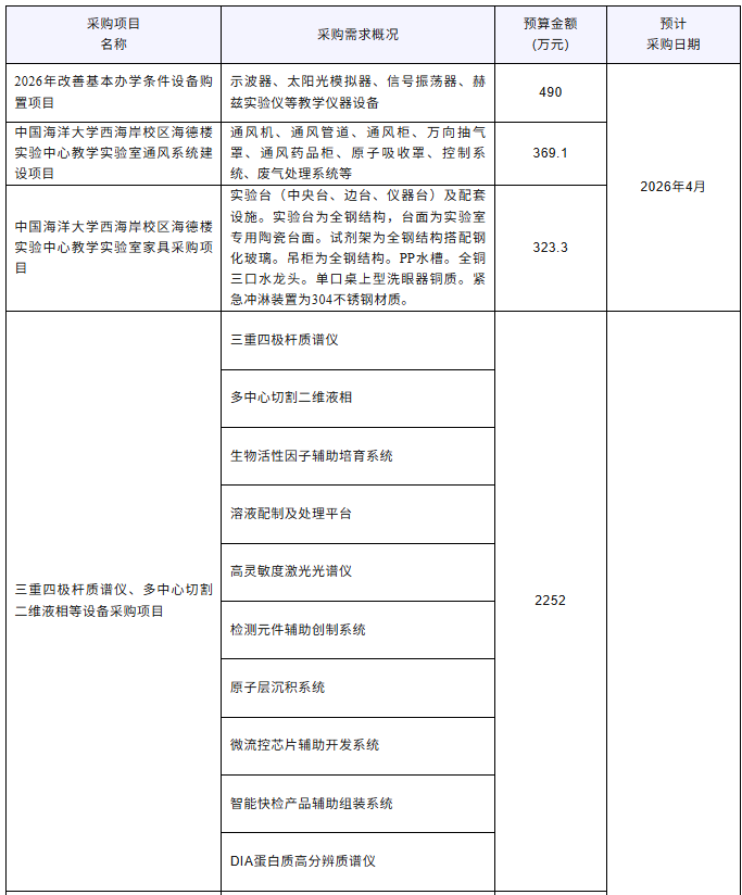 近期,中國海洋大學發布多項儀器采購意向,計劃采購三重四極桿質譜儀、高靈敏度激光光譜儀、原子層沉積系統、DIA蛋白質高分辨質譜儀、真空帶式連續干燥機、石英晶體微天平、X射線衍射儀、研究級偏光顯微鏡等儀器設備,預算總金額11275萬元。預計采購時間2026年4月~6月。