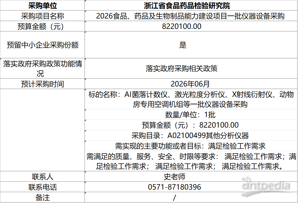 423日,浙江食藥檢院發布20266月至12月政府采購意向,擬采購AI菌落計數儀、激光粒度分析儀、X射線衍射儀、動物房專用空調機組等一批儀器設備,預算金額為822.01萬元。