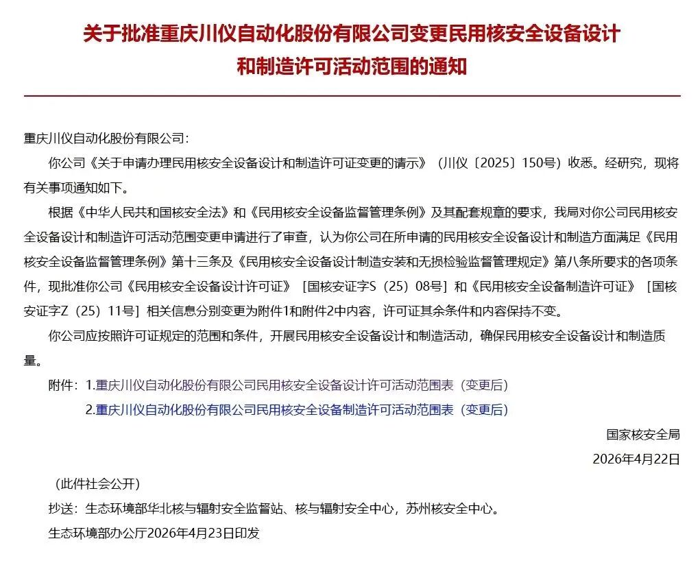 為加快推動核電關(guān)鍵儀表自主可控進程,川儀股份通過多輪技術(shù)論證、系統(tǒng)化驗證及嚴苛的鑒定試驗,成功攻克核心技術(shù)難題,順利取得該類設(shè)備的民用核安全設(shè)備設(shè)計和制造資質(zhì),實現(xiàn)從產(chǎn)品研發(fā)到工程應(yīng)用的自主可控全鏈條貫通,為后續(xù)核電項目規(guī)模化供貨及產(chǎn)業(yè)化應(yīng)用奠定了堅實基礎(chǔ)。